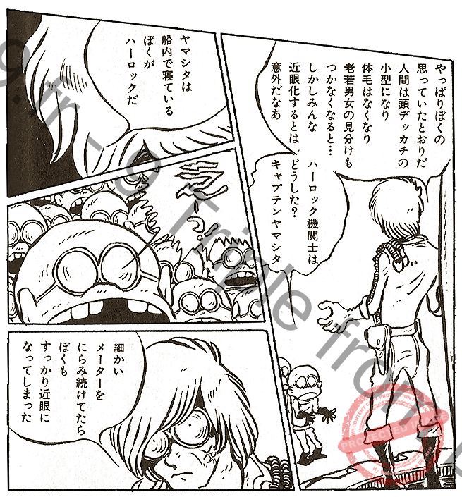 Je n’ai pas énormément d’informations sur ce récit dont le titre peut se traduire par « La lobotomie effroyable du docteur diabolique » (tout un programme). Il n’a, à ma connaissance, jamais été réédité, et est donc entouré de mystère. D’après les informations que j’ai pu glaner sur des blogs japonais, Harlock y serait le nom d’un étudiant en médecine allemand assassiné au cours de l’histoire.